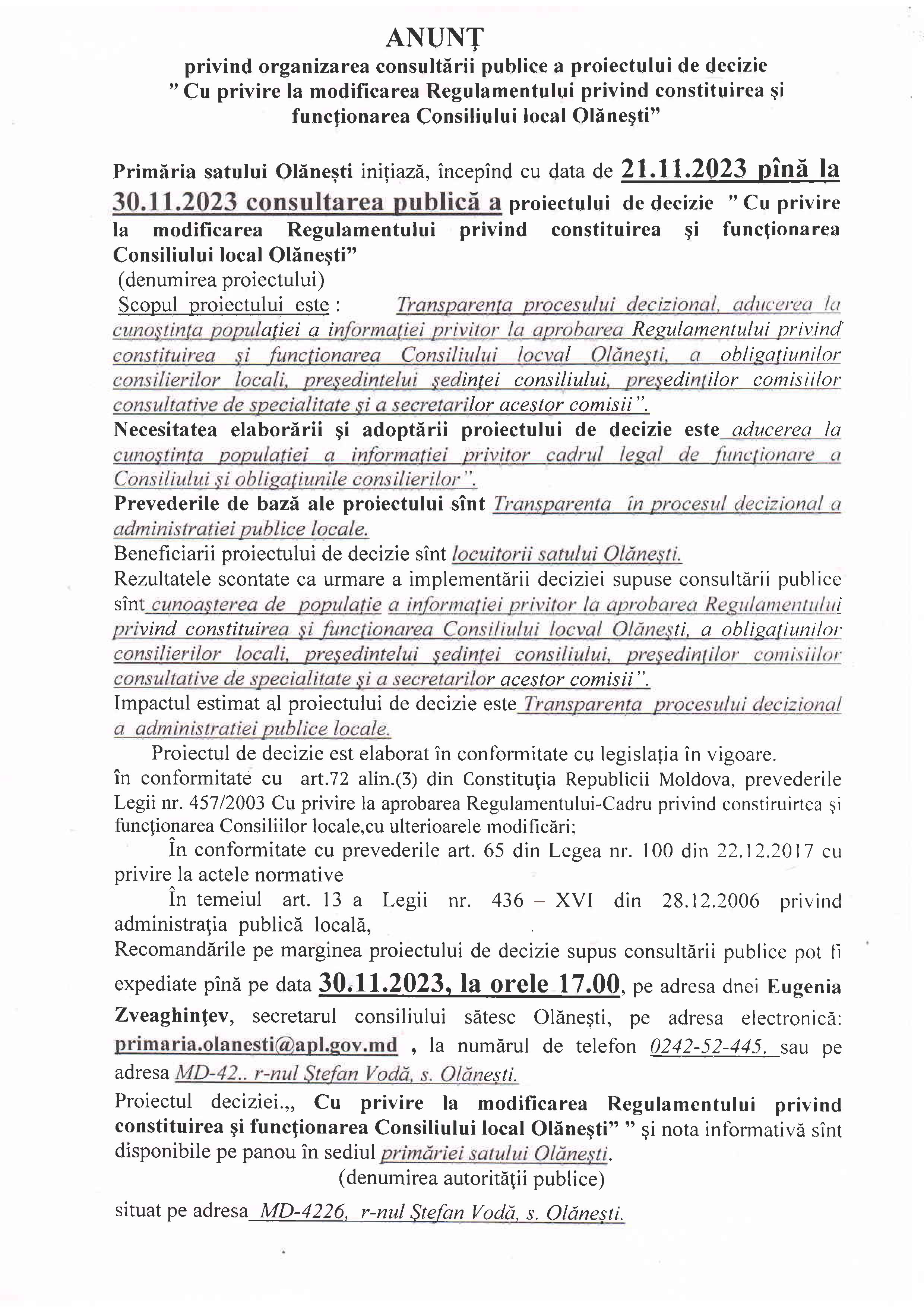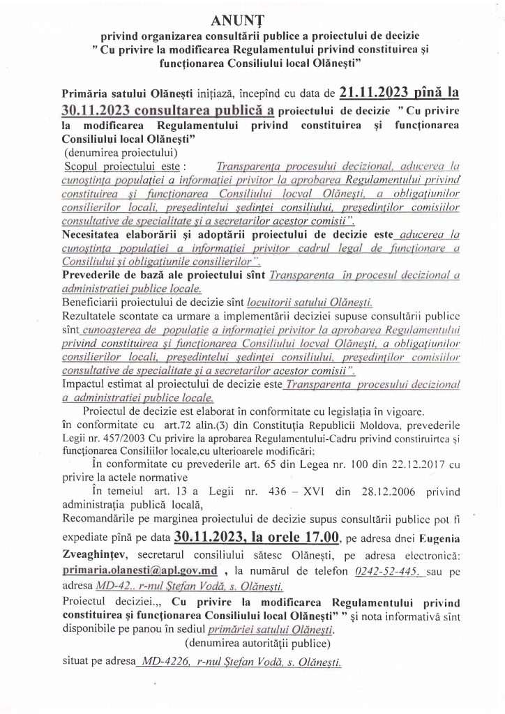 Anunț privind organizarea consultării publice a proiectului de decizie „Cu privire la modificarea Regulamentului privind constituirea și funcționarea Consiliului local Olănești”