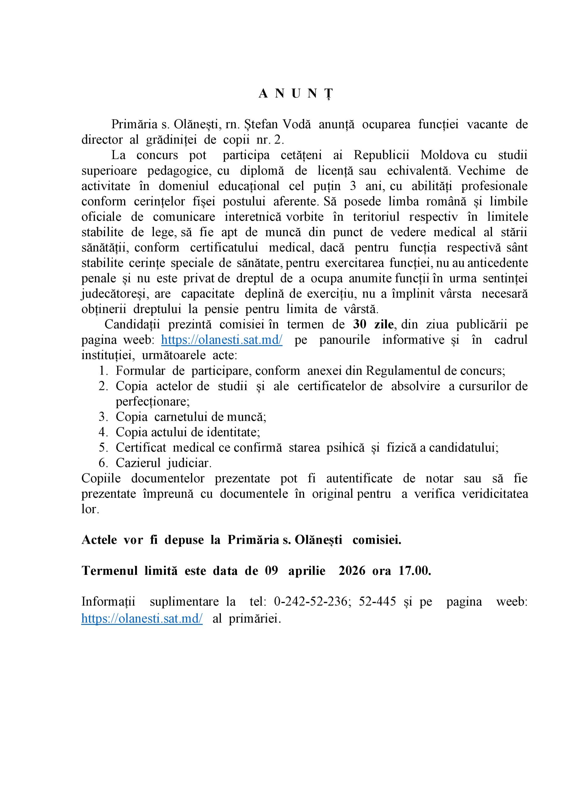 8 Octombrie, 2025 Funcții vacante Noutăți ANUNȚ prelungirea perioadei de depunere a dosarelor pentru ocuparea funcției vacante de director al grădiniței nr.1 Citește mai mult